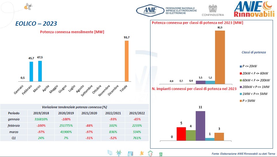 In aumento (complessivamente del +761%) rispetto al 1° trimestre del 2022 il contributo dei 94 MW di eolico distribuito su 24 nuove installazioni ma ancora troppo lenta la crescita di queste ultime.