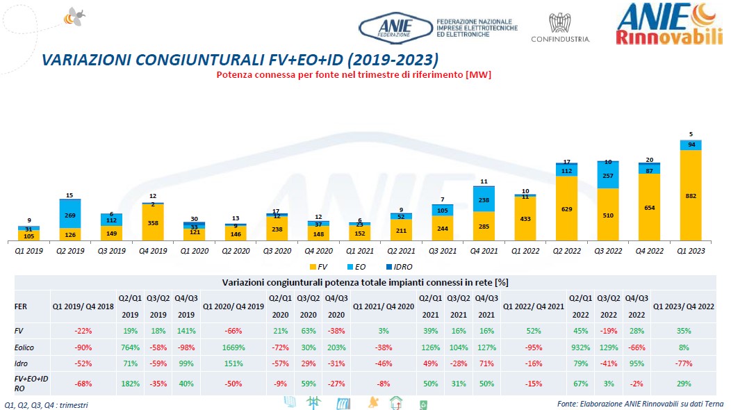 Dal confronto del 1° trimestre del 2023 (Q1 2023) con il 4° trimestre del 2022 (Q4 2022) emerge che il fotovoltaico nel Q1 2023 ha conseguito un incremento del +35% rispetto al Q4 2022, l’eolico un incremento del +8%, mentre l’idroelettrico un decremento del -77%. Complessivamente nel Q1 2023 le FER raggiungono un risultato positivo del +29%.