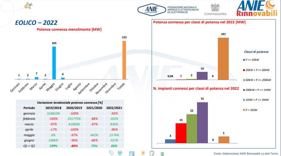A livello regionale, solo in Puglia si registra un trend crescente rispetto al 1° semestre del 2021, periodo nel quale le Regioni a più alta ventosità (Basilicata, Calabria, Campania, Sardegna e Sicilia) registrano un eclatante stop della corsa all’eolico. In tutto il resto del territorio, invece, si rilevano variazioni molto meno marcate.