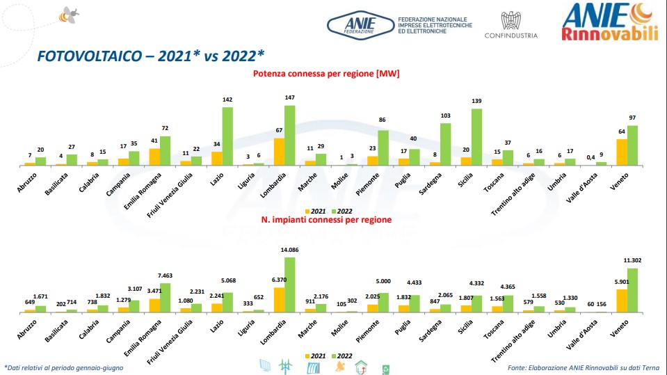 Dal punto di vista regionale, Friuli-Venezia Giulia, Piemonte, Trentino-Alto Adige e Valle d’Aosta segnano il maggior incremento di nuova potenza installata rispetto al 1° semestre 2021.