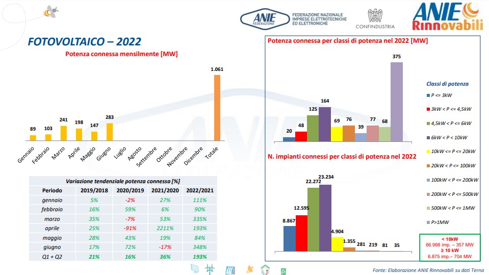 Gli impianti di taglia > 1 MW realizzati nel 1° semestre sono 35, di cui 20 nel 2° trimestre (per una potenza complessiva di 251,6 MW). Tra questi ultimi, 4 sono di potenza > 10 MW: uno situato nella provincia di Cagliari da 82,3 MW, uno nella provincia di Novara da 12,6 MW, uno a Catania da 33 MW ed infine uno a Trapani da 66 MW. Complessivamente sono stati connessi alla rete da gennaio a giugno 2022 quasi 74.000 impianti.