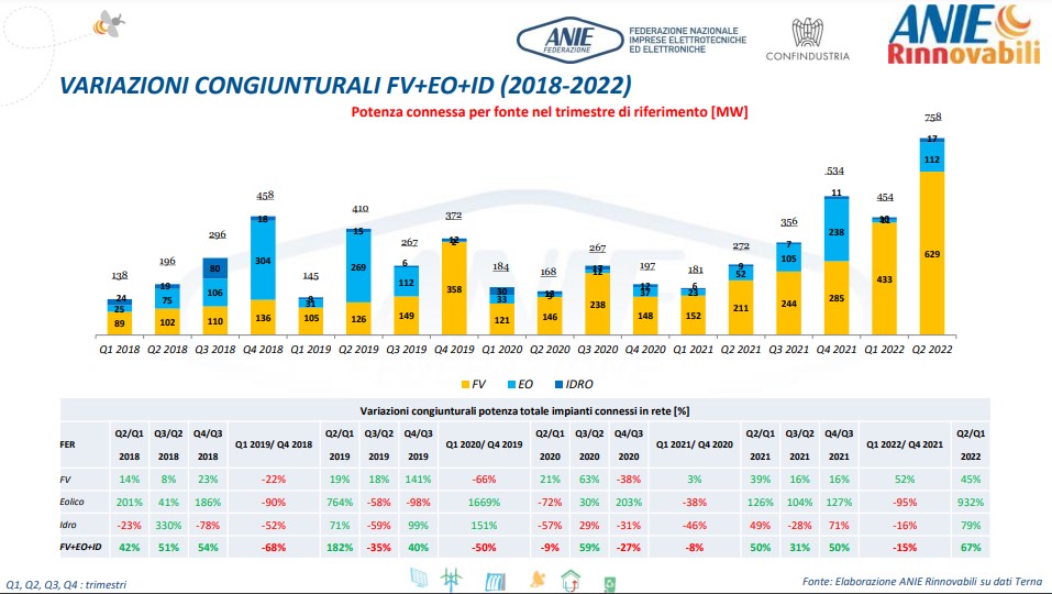 Dal confronto del 2° trimestre del 2022 (Q2 2022) con il 1° trimestre (Q1 2022) emerge che il fotovoltaico ha conseguito un incremento del +45%, l’eolico del +932%, mentre l’idroelettrico del +79%. Complessivamente nel Q2 2022 le FER raggiungono un risultato positivo del +67%.