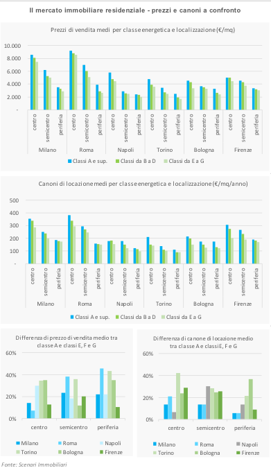“Nonostante la ricerca abbia confermato un rapporto direttamente proporzionale tra la classe energetica di appartenenza e le quotazioni immobiliari – dichiara Francesca Zirnstein, Direttore Generale Scenari Immobiliari – uno sguardo più attento alle dinamiche interne ai principali centri urbani suggeriscono una sostanziale indifferenza rispetto allo ‘sconto’ derivante da minori spese per l’approvvigionamento energetico. Con l’eccezione del mercato residenziale, sia canoni che prezzi di immobili in classe A risultano più elevati non tanto dove i risparmi energetici possano avere un impatto considerevole sulla riduzione delle spese vive degli occupanti, quanto dove il conseguimento di buone performance energetiche è conseguenza di interventi eseguiti con elevati standard qualitativi. Si ripropone quindi l’ipotesi per la quale l’efficienza energetica degli edifici negli ultimi anni sia stata frutto di imposizioni arrivate con l’evoluzione delle normative vigenti nate dall’adesione a impegni a scala comunitaria, rispetto ad una sostanziale indifferenza da parte della domanda nei confronti dei possibili risparmi dovuti a edifici più efficienti”.