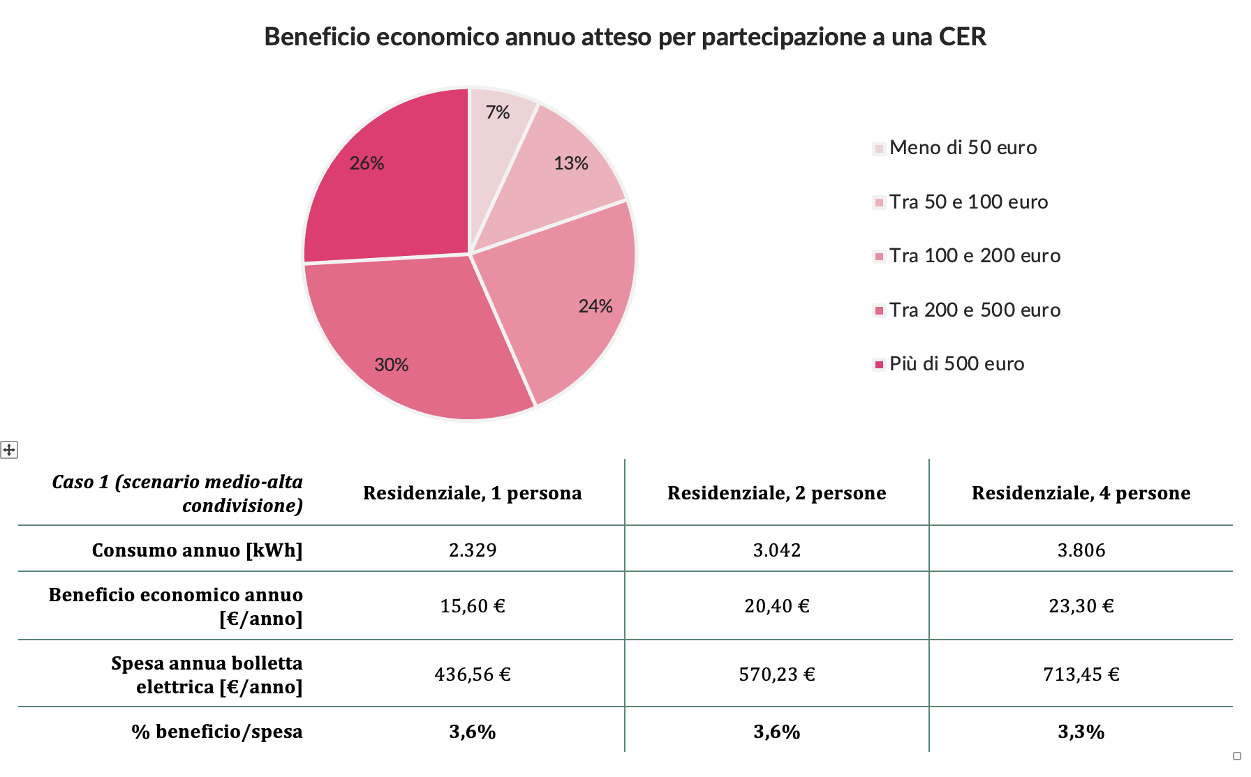 È fondamentale, quindi, fare i conti con questa dimensione e settare correttamente le aspettative: un sondaggio effettuato su 1.000 cittadini (il 21% dei quali già partecipava a una CER) ha evidenziato che l’80% del campione si attende ritorni annui superiori a 100 euro l’anno e solo il 7% si aspetta di ricevere un valore inferiore a 50 euro, cifra più vicina alla realtà. Rispetto alla spesa annua per la bolletta elettrica, infatti, il risparmio si aggira sul 3-4%, una quota non sufficiente a suscitare interesse in larga parte della popolazione.