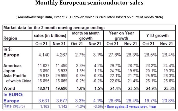 Le vendite europee di semiconduttori nel mese di novembre 2021 raggiungono i 4,267 miliardi di dollari, con un aumento del 26,3% rispetto allo stesso mese dell’anno precedente. Rispetto a ottobre 2021, si registra una crescita del 3,1%. Sempre nel mese di novembre, su base mondiale, si registra un giro di affari 49,690 miliardi di dollari, in aumento dell’1,5% rispetto a ottobre e del 23,5% rispetto a novembre 2020. Questi risultati confermano la forte crescita registrata in Europa e nel mondo per tutto il 2021.