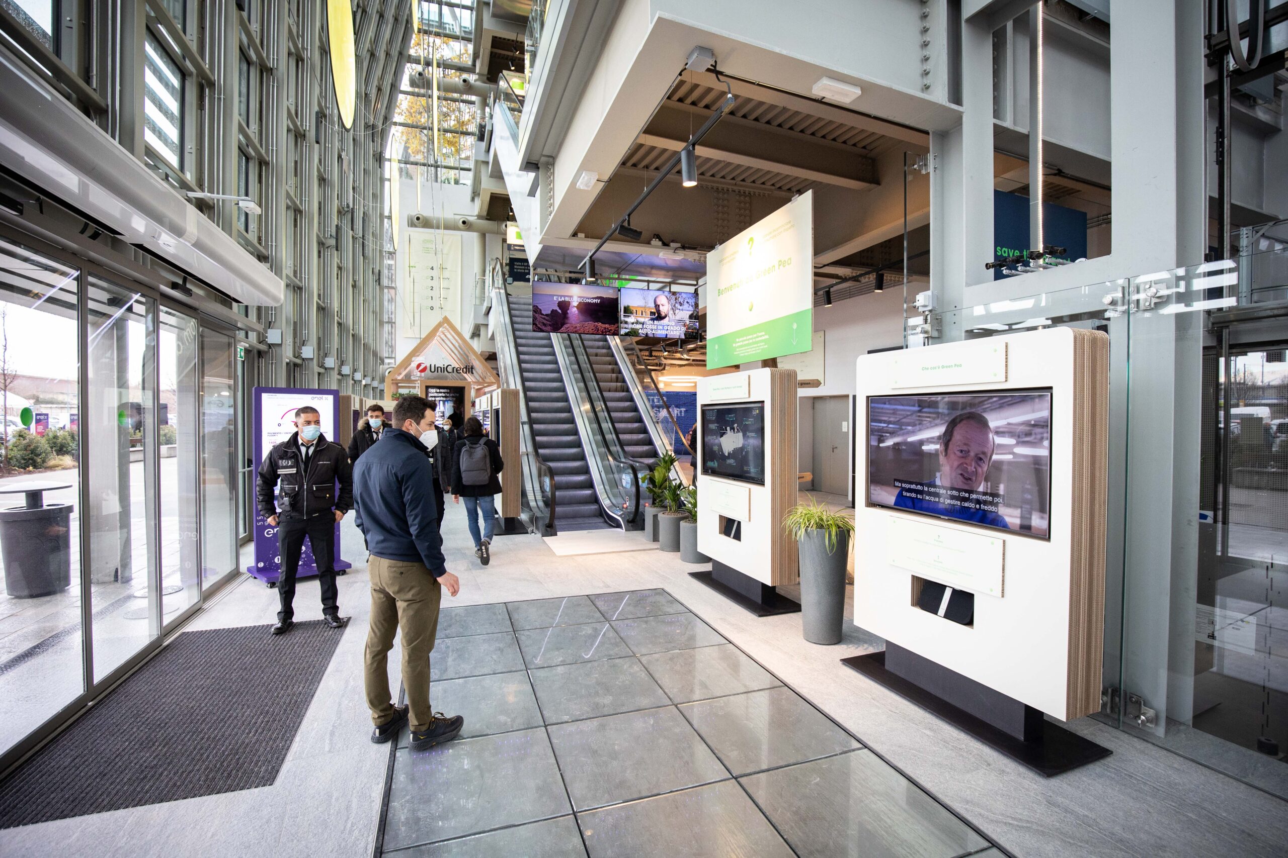 Le pavimentazioni cinetiche realizzate da Energy Floors sono state installate nel nostro paese, per la prima volta, all’ingresso dei vari piani di Green Pea, l’innovativo retail park dedicato al “green lifestyle” recentemente inaugurato a Torino. In questo caso si tratta di piastre flottanti dalla forma rettangolare, rivestite superiormente con uno strato metallico anti-usura, che trasformano l’energia del calpestio in elettricità contribuendo al contenimento dei consumi energetici dell’intero department store.