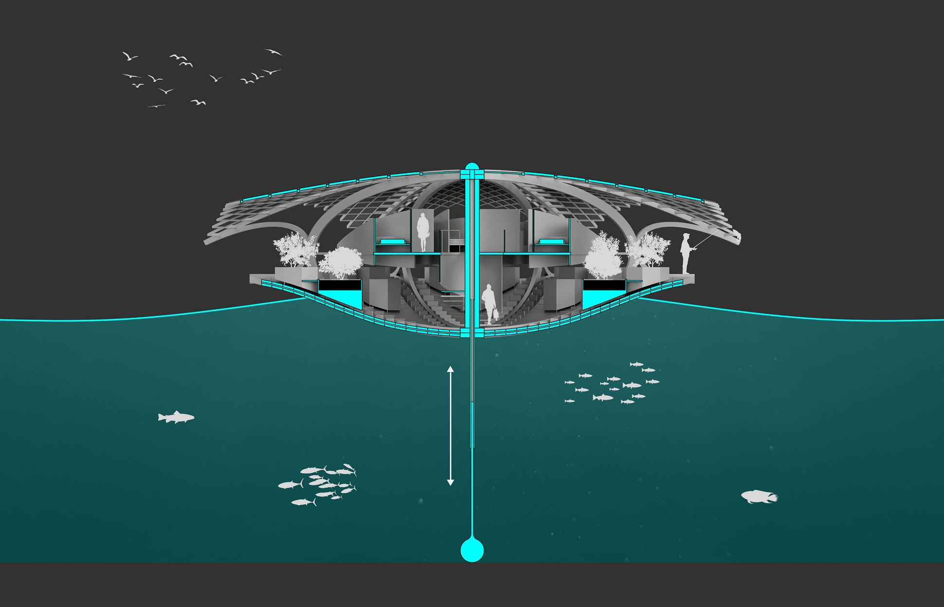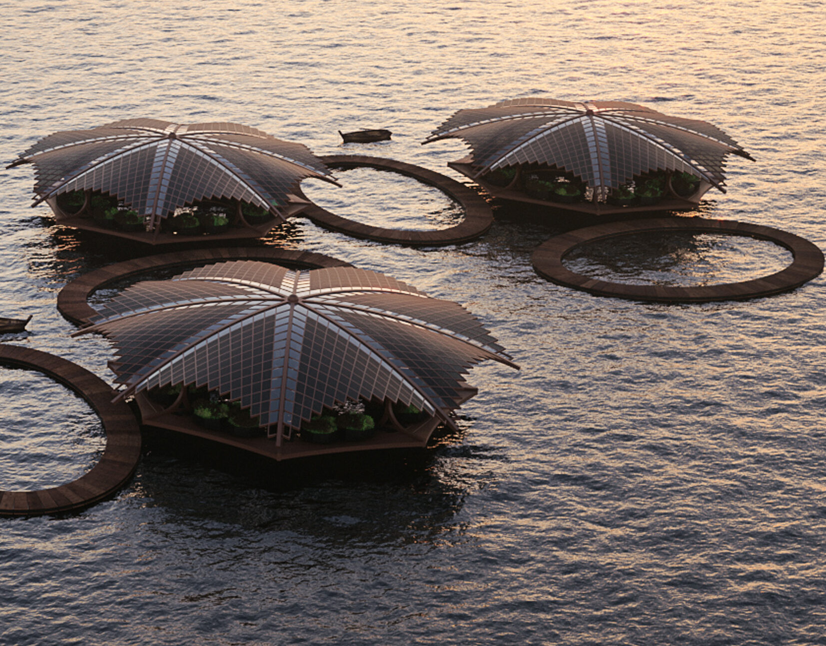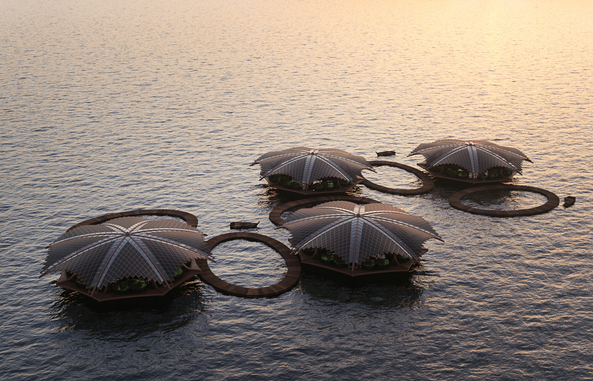 Le residenze galleggianti di Floating Lotus sono concepite per ospitare una famiglia e per accogliere tutte le attività domestiche, compresa la coltivazione di piante commestibili. Oltre ai moduli fotovoltaici che rivestono la copertura, l’elettricità è prodotta continuamente sfruttando il movimento ondulatorio della superficie del mare.