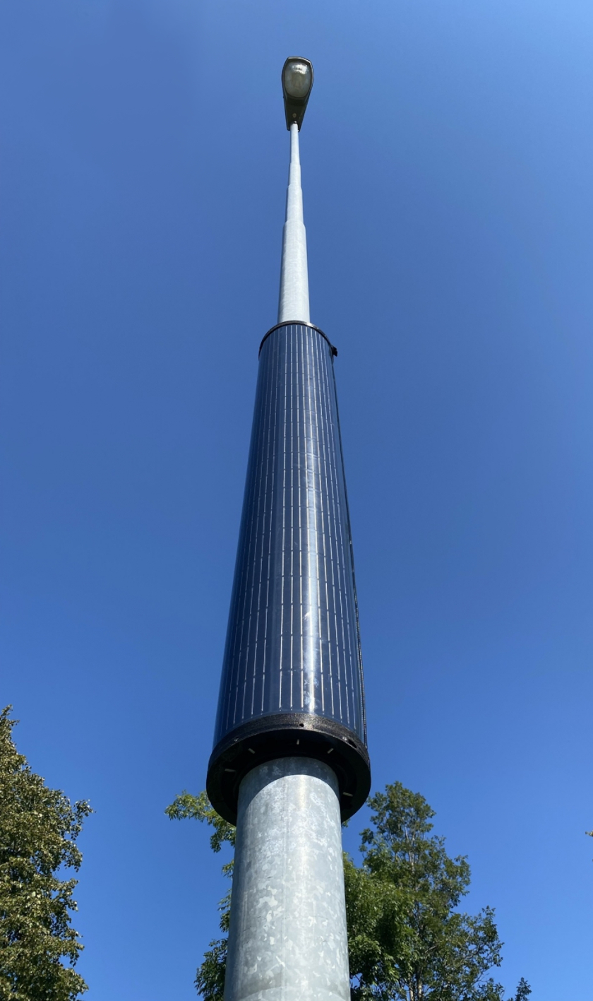 Ciascun lampione (altezza circa 12 m) è rivestito da un pannello solare rigido di 4,80 m, che alimenta la lampada a led posta sul braccio. Oltre all’autoproduzione di energia e all’integrazione architettonica, il vantaggio di questi pannelli BIPV consiste nel fatto che non serve orientarli, perché si adattano alla forma del rispettivo supporto.