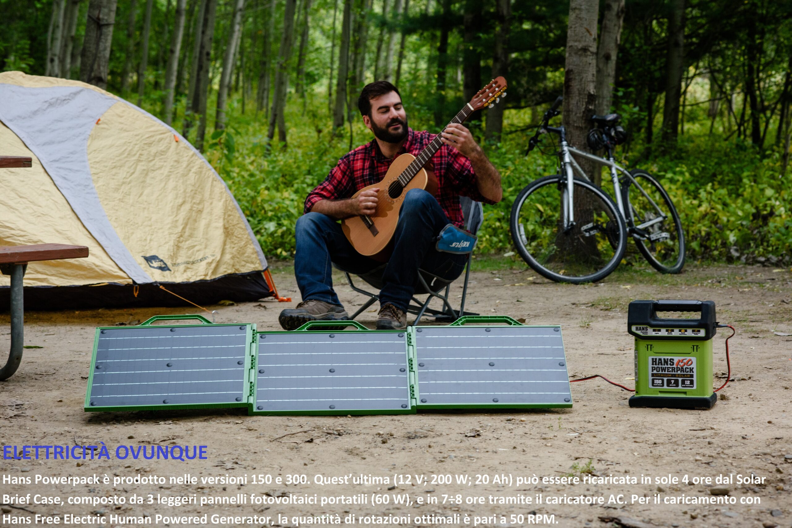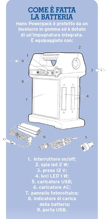 Hans Powerpack è una batteria portatile agli ioni di litio (peso 4 kg) con funzionamento garantito per 12 anni (1.000+ cicli di ricarica), in grado di immagazzinare elettricità da diverse fonti, prima fra tutte quella fotovoltaica grazie a un kit di pannelli portatili.