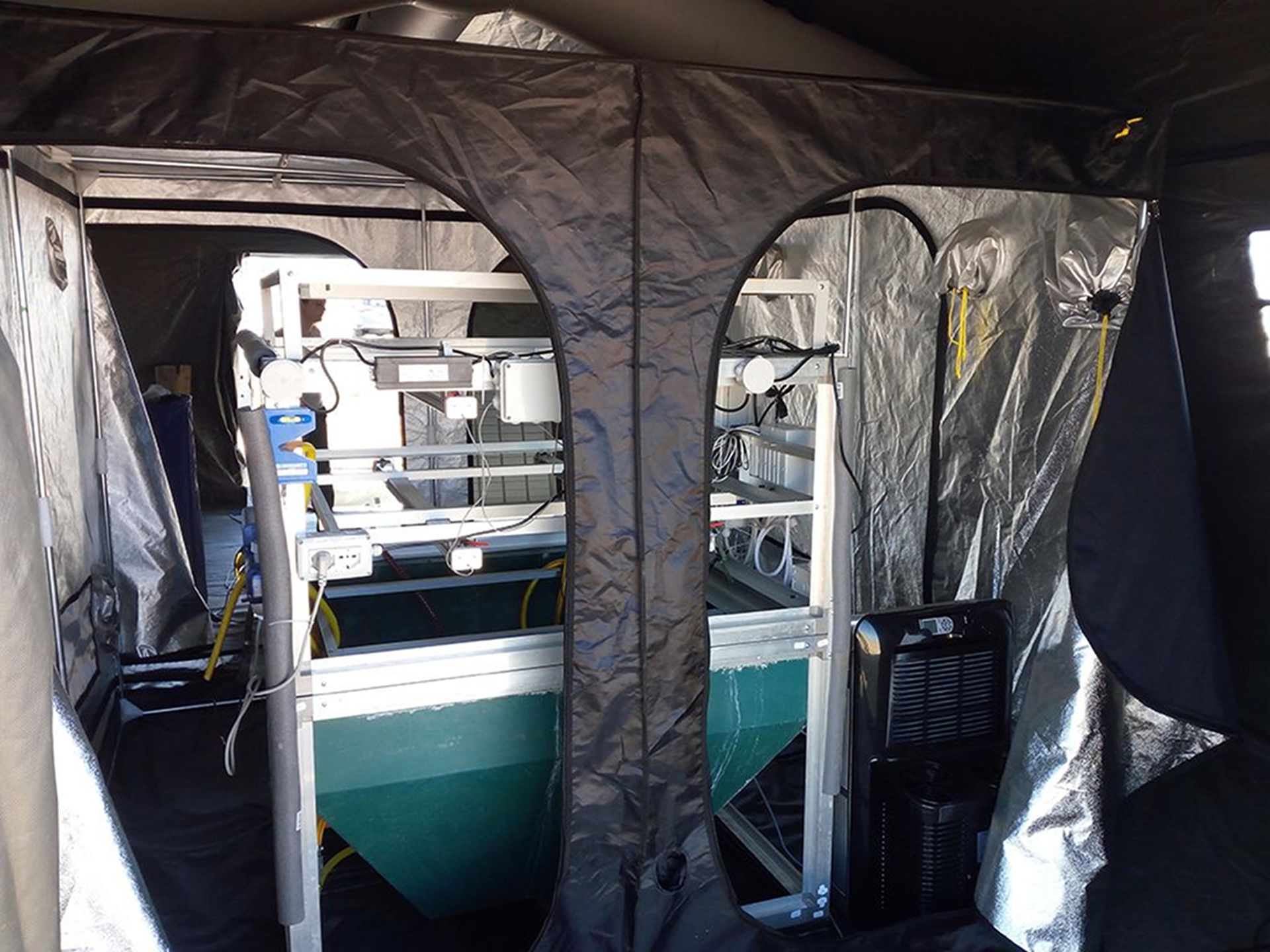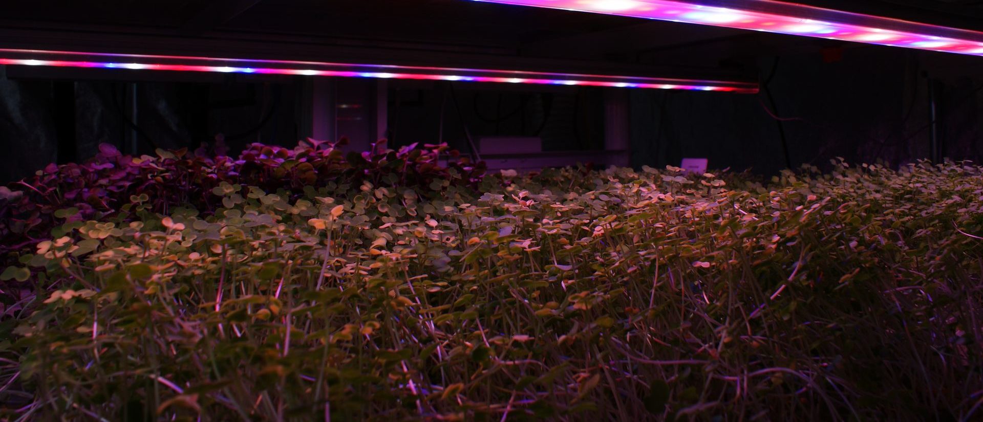 Ciascuno dei piani di HortExtreme è illuminato da 2 lampade Grow Light di Heliospectra LightBar (92 W; 120-277 VCA, 50/60 Hz), un prodotto sviluppato appositamente per la coltivazione verticale: consente infatti la regolazione dello spettro luminoso per una vasta gamma di piante, erbe e fiori. In questo caso la miscela è composta da luce blu (450 nm), bianca (5700 k) e rossa (660 nm), uniformemente grazie a 48 diodi singoli.
