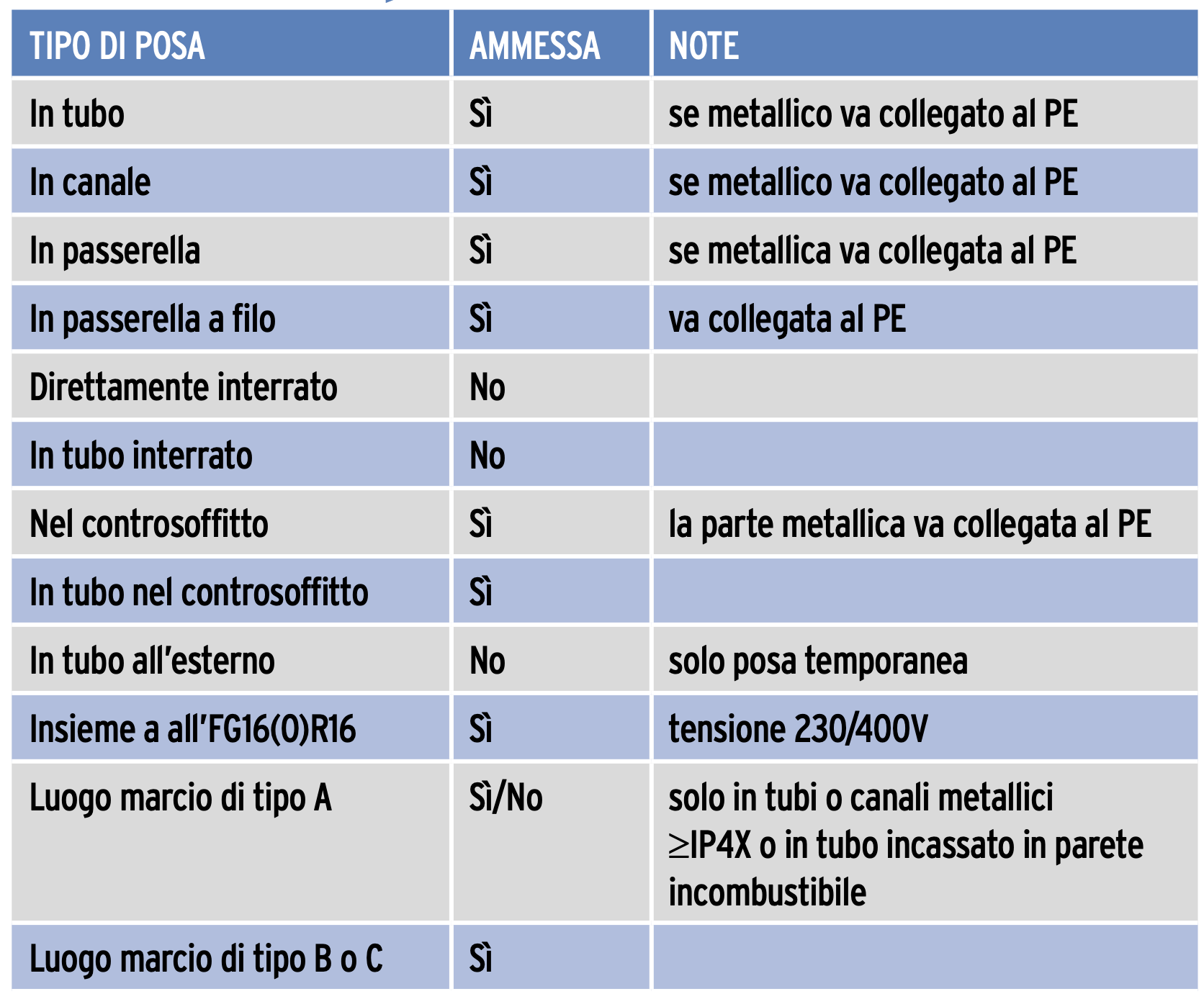 Riassumendo i ragionamenti di cui sopra, l’FS18OR18 non necessita di protezione meccanica aggiuntiva ma non è un cavo di classe II, di conseguenza può essere posato anche in passerella o canale senza coperchio, ma se quest’ultimi sono di metallo sono da considerarsi masse e devono quindi essere messi a terra.