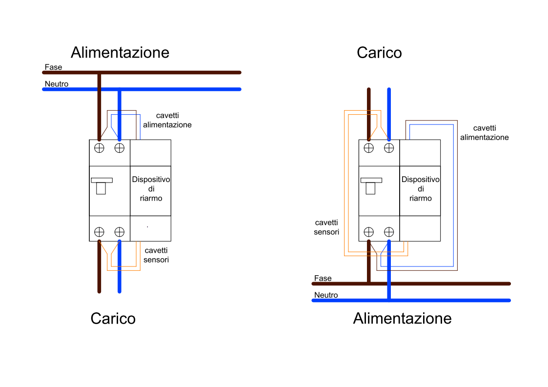 Il cablaggio di questi dispositivi è molto simile a quello degli interruttori tradizionali, eccezion fatta per alcuni modelli che sono dotati di cavetti sottili (di alimentazione e per i sensori) che vanno collegati come raffigurato in figura.