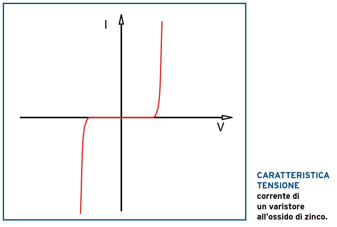 Gli SPD possono essere costituiti da spinterometri (piccolo spazio d’aria tra due parti metalliche in tensione) e/o da varistori che sono particolari resistori che hanno la proprietà di variare la resistenza in funzione della tensione (ved. grafico). Quando la tensione tra i conduttori attivi o verso terra supera un certo valore gli SPD diminuiscono bruscamente la loro resistenza e iniziano a condurre grandi correnti limitando in questo modo la sovratensione.