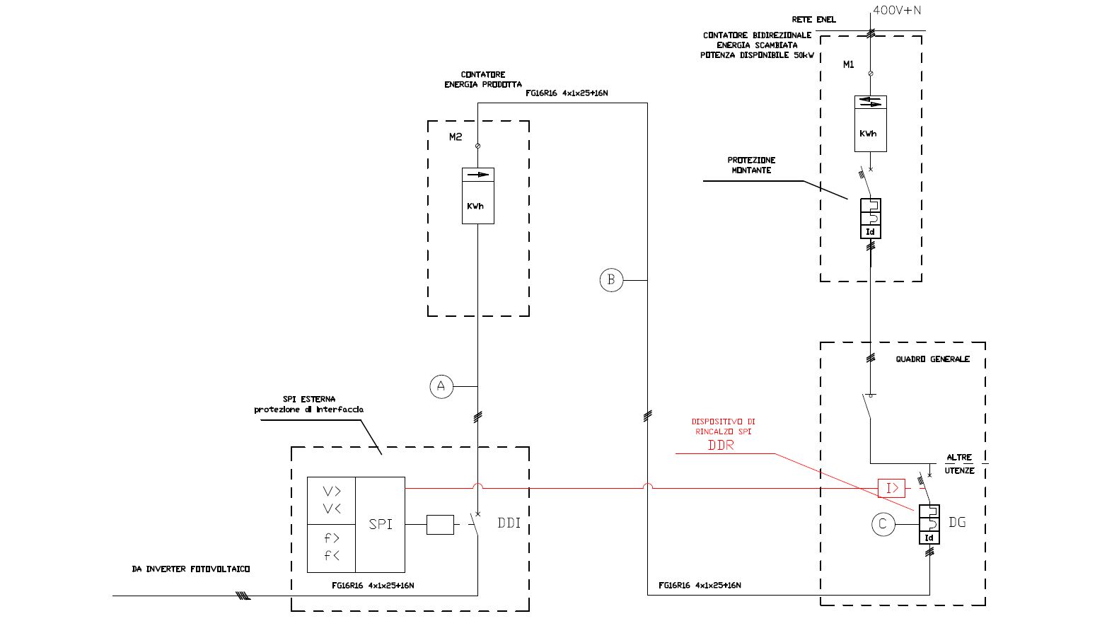 Il rincalzo protezione d’interfaccia è un ulteriore dispositivo di riserva oltre al teleruttore, comandato dalla protezione d’interfaccia. Si può realizzare, dotando di bobina di sgancio, un interruttore automatico. Se l’interfaccia comanda lo sgancio del teleruttore, e questo non si apre, l’SPI invia corrente alla bobina di sgancio dell’interruttore aprendo in modo sicuro il circuito di produzione come indicato nello schema qui presente.