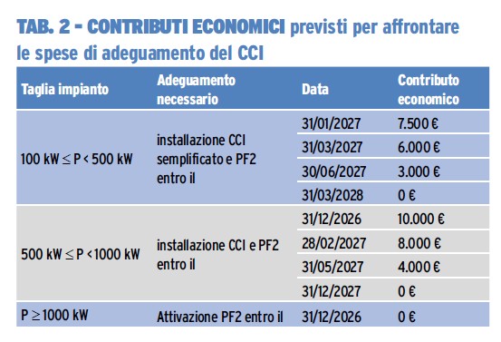 Gli impianti di produzione nuovi con potenza superiore a 100 kW hanno l’obbligo del CCI per poter essere connessi alla rete e per essi non sono previsti contributi di natura economica. Gli impianti esistenti dovranno essere adeguati in tempi inversamente proporzionali alla potenza d’impianto. Per affrontare le spese di adeguamento sono previsti contributi economici per chi interviene prima della scadenza ultima, come specificato in dettaglio in tabella 2.