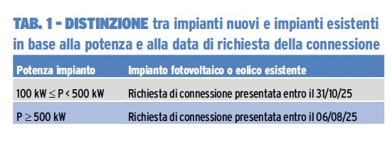 Occorre fare una prima distinzione tra impianti nuovi e impianti esistenti in base alla potenza e alla data di richiesta della connessione come specificato in tabella 1.