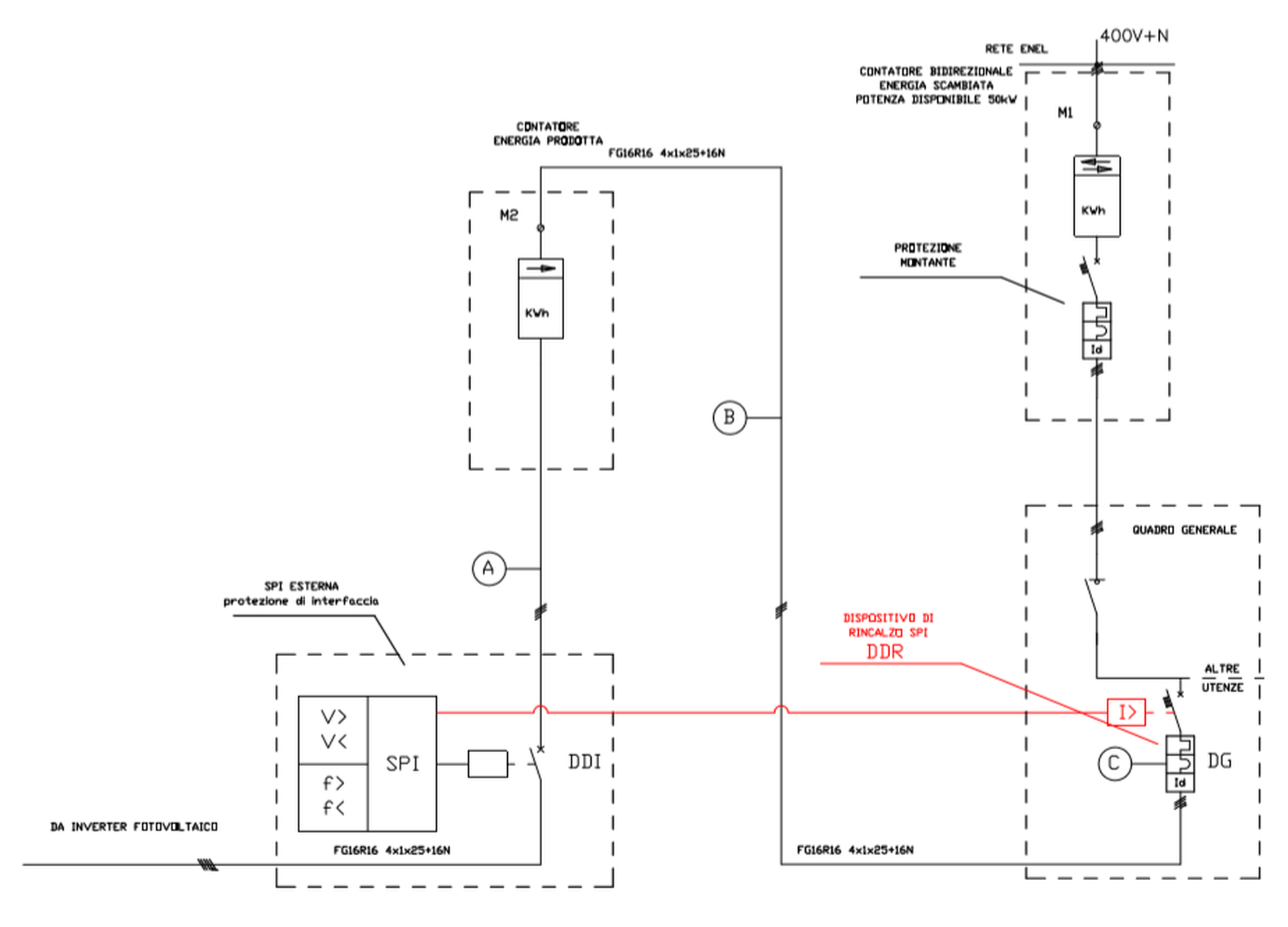 Il rincalzo protezione d’interfaccia è un ulteriore dispositivo di riserva oltre al teleruttore, comandato dalla protezione d’interfaccia. Si può realizzare, dotando di bobina di sgancio, un interruttore automatico. Se l’interfaccia comanda lo sgancio del teleruttore, e questo non si apre, l’SPI invia corrente alla bobina di sgancio dell’interruttore aprendo in modo sicuro il circuito di produzione come indicato nello schema qui presente.