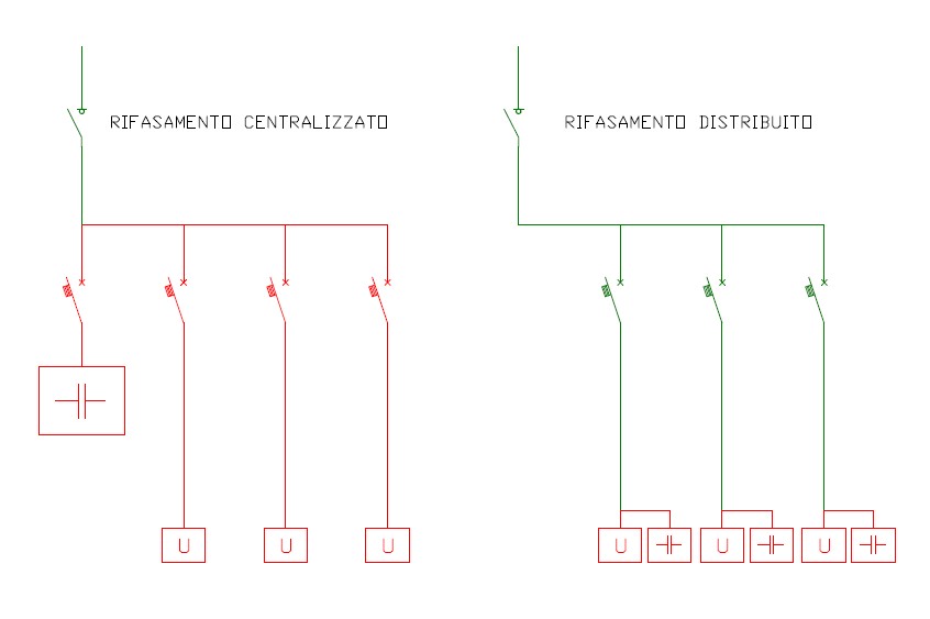 Nel rifasamento centralizzato i condensatori sono installati direttamente nei quadri principali di distribuzione; sono impiegate normalmente batterie frazionate in più gradini che vengono inseriti da una centralina di rifasamento automatico in funzione dell’andamento del carico durante l’arco della giornata.