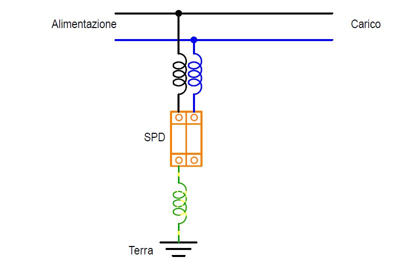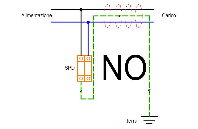 La grande corrente impulsiva, attraversando queste elevate reattanze induttive, dà origine a cadute di tensione elevate (circa 1 kV al metro) che vanificano in parte l’effetto benefico dell’SPD. Per questa ragione è necessario tenere i cavi di collegamento il più corti possibile, al massimo mezzo metro.