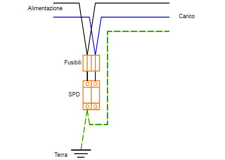 Come illustrato in figura 4, è molto importante che la porzione di cavo di terra interessata dalla corrente impulsiva transiti il più lontano possibile dei conduttori attivi a valle dell’SPD, questo per evitare che la brusca variazione di corrente induca forti sovratensioni sull’impianto utilizzatore. Per l’installazione degli scaricatori di tensione è importante fare riferimento alle istruzioni del costruttore per la taglia dei fusibili, la sezione dei cavi ed eventuali altri parametri.