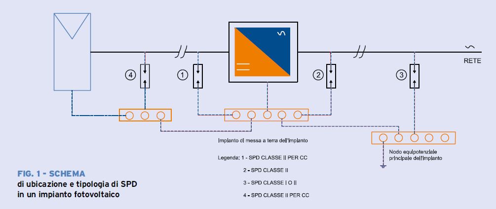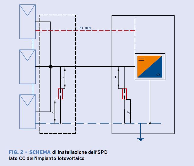 Nel caso di impianti installati dove la probabilità di incidenza dei fulmini diretti è bassa, può essere installata solo la protezione contro le sovratensioni indotte dalle scariche che si verificano in prossimità di moduli fotovoltaici e linee elettriche. La posizione e il tipo di SPD installato nell’impianto fotovoltaico, per la protezione contro le sovratensioni causate da fulmini indiretti, sono mostrati in figura 1.