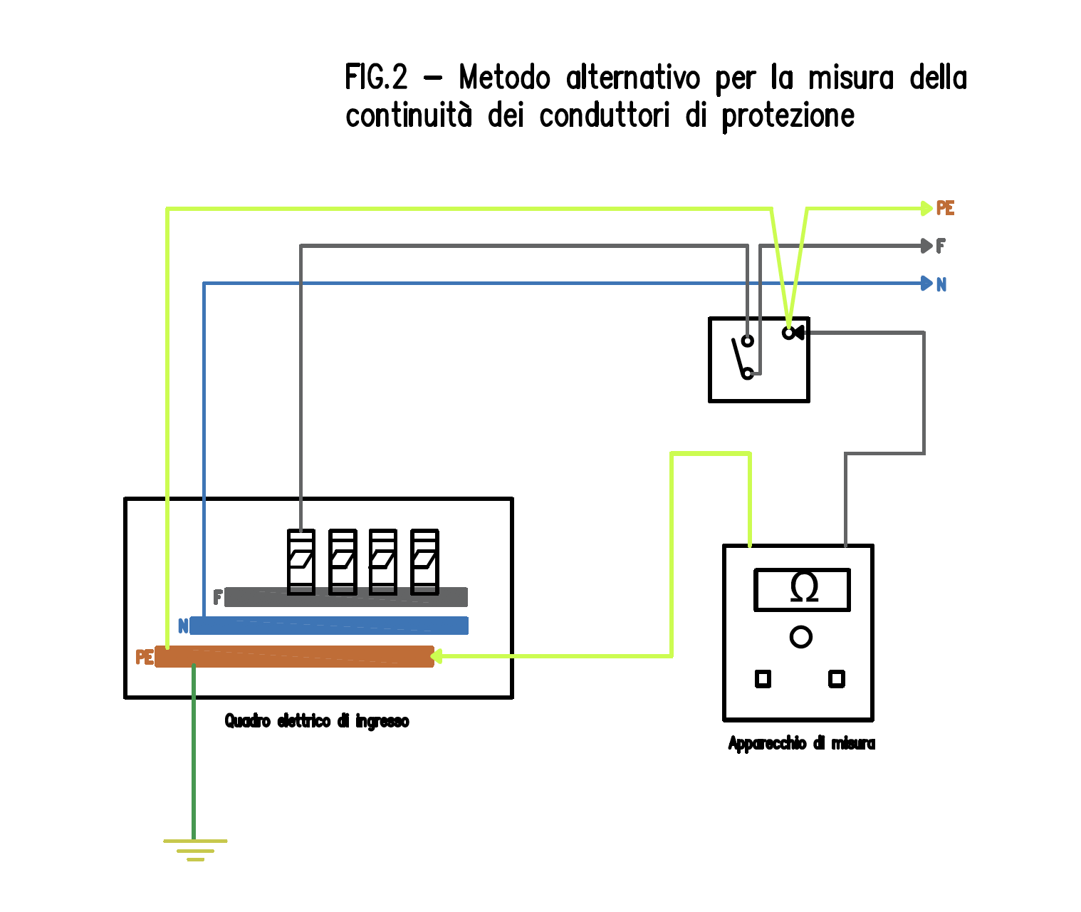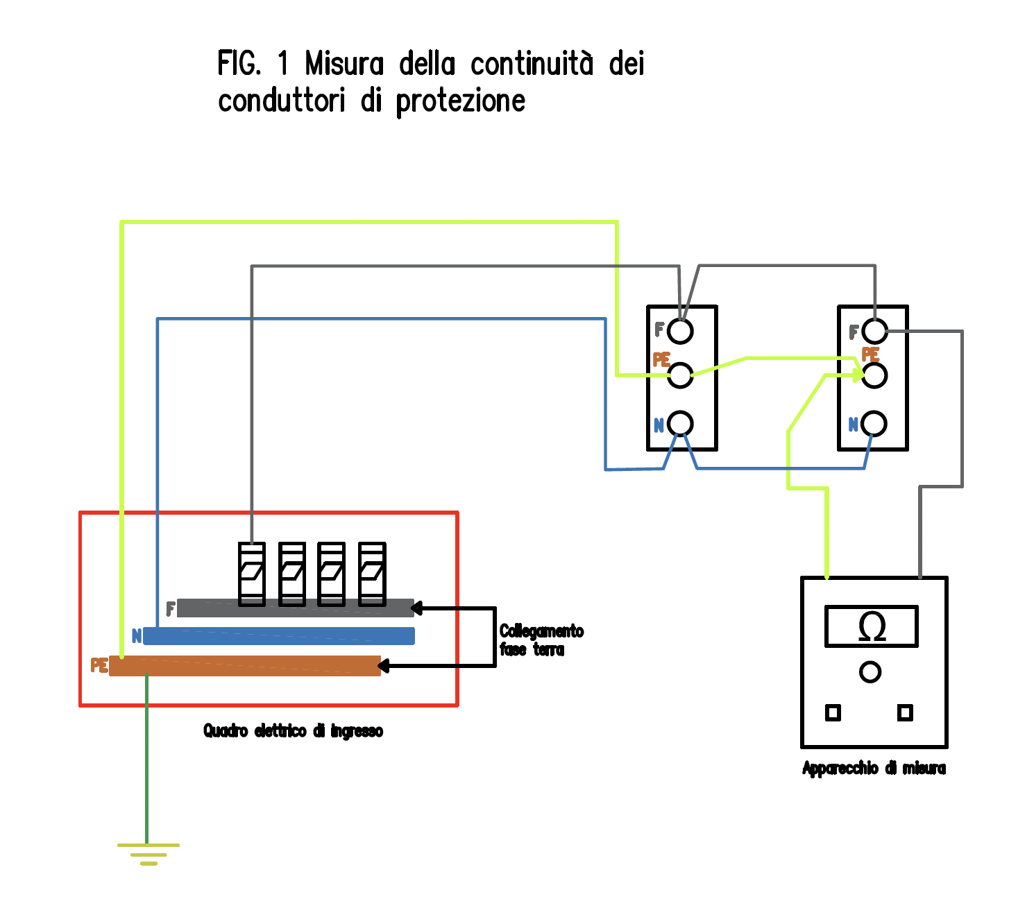 Un metodo per verificare la continuità dei conduttori di protezione negli impianti di medie e grandi dimensioni è rappresentato in figura 1 e la procedura è la seguente.