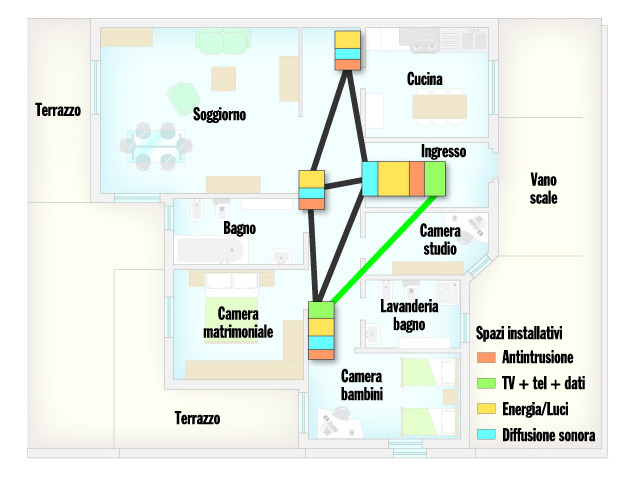 Negli ambienti residenziali la CEI 64-8 prescrive infatti che l’installatore elettrico deve comunque predisporre tubi, cassette e scatole necessari anche per gli impianti elettronici. In generale nella realizzazione dell’installazione elettrica le dimensioni interne dei tubi protettivi e dei relativi accessori devono essere tali da permettere di tirare i cavi dopo la messa in opera di questi tubi protettivi e relativi accessori. In particolare in ambiente residenziale la CEI 64-8 prescrive che i cavi devono essere sfilabili qualunque sia il livello dell’impianto (L1,L2,L3), ad eccezione di elementi prefabbricati o precablati. A tal fine, il diametro interno dei tubi protettivi di forma circolare deve essere almeno pari a 1,5 volte il diametro del cerchio circoscritto al fascio di cavi che essi sono destinati a contenere,con un minimo di 16 mm.