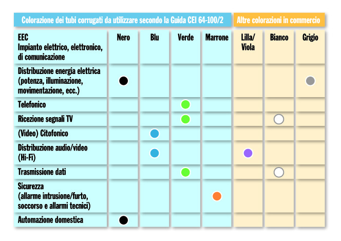 Guida per la predisposizione delle infrastrutture per gli impianti elettrici, elettronici e per le comunicazioni. Parte 2: Unità immobiliari (appartamenti), consiglia l’utilizzo di tubi corrugati in materiale isolante e di colore differenziato in particolare indica la distribuzione dei colori come indicato nella tabella.