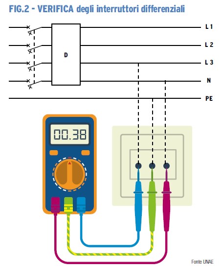Naturalmente, la prova va condotta con strumentazione dotata di impostazione della taratura. Sono riportati schemi delle varie modalità possibili di esecuzione della verifica (in figura 2 si vede una prova eseguita direttamente alla presa a spina, tenendo conto della posizione della fase e del neutro).
