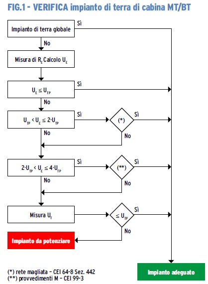 - 2·UTP < UE ≤ 4·UTP: l’impianto è efficiente solo a condizione che siano adottati i provvedimenti M descritti nell’allegato E della Norma CEI 99-3 (in pratica, si aumenta la resistività superficiale del terreno asfalto; in caso di recinzioni, si consiglia di usare materiale isolante o equipotenzializzare). La possibilità di applicare i provvedimenti M è in generale riservata all’ipotesi di cabina isolata senza trasferimenti di potenziale.
