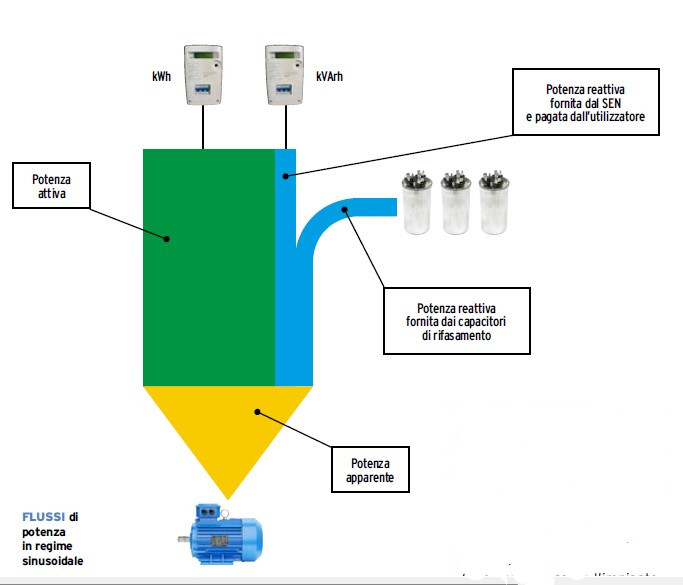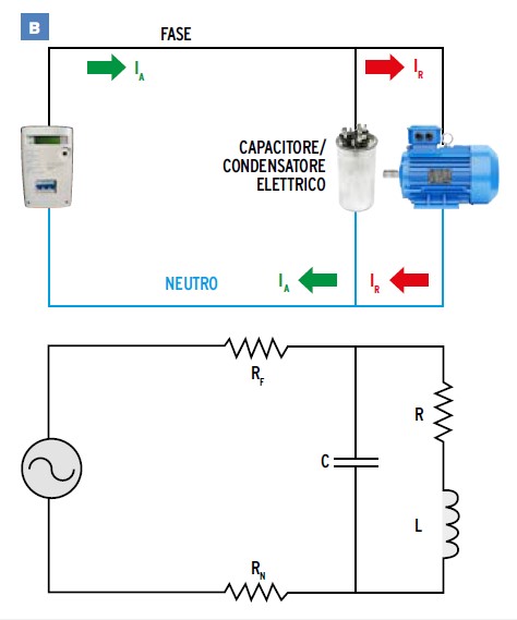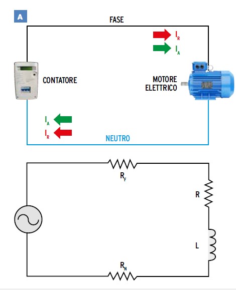 In regime sinusoidale, ogni volta che un carico elettrico non è puramente resistivo ma presenta una parte “reattiva” tra la tensione di alimentazione e la corrente che circola nell’impianto, si viene a creare uno sfasamento angolare, quantificabile tramite il fattore di potenza o cosφ. Ciò capita quando nell’impianto sono presenti componenti induttivi come bobine, trasformatori, avvolgimenti dei motori, ecc.