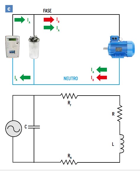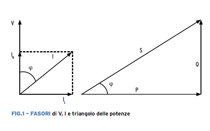 Si nota come la corrente possa essere scomposta in due compenti: una dovuta alla parte resistiva del carico in fase con la tensione (IR), l’altra ortogonale alla tensione dovuta alla parte reattiva del carico (IL). La corrente totale I, data dalla somma vettoriale di IR e IL, risulta sfasata e l’angolo φ in ritardo rispetto alla tensione. A questo sfasamento fra la tensione e la corrente corrisponde, dal punto di vista energetico, la comparsa nell’impianto di tre forme di potenza: