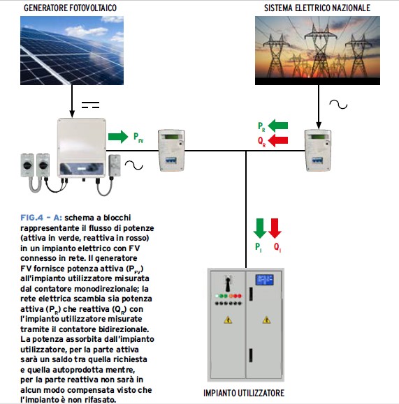 Si consideri il caso – assai frequente – di un impianto esistente in cui viene installato un generatore fotovoltaico che, normalmente, fornisce solo potenza attiva. Mentre la potenza reattiva richiesta alla rete è sempre la stessa, quella attiva diminuisce della quantità pari a quella fornita dal generatore fotovoltaico, come è raffigurato nella figura 4.