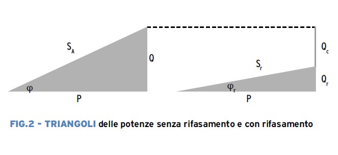 La figura 2 mette in evidenza la situazione delle potenze prima (triangolo a sinistra) e dopo (triangolo a destra) del rifasamento: la potenza reattiva Q inizialmente assorbita dall’impianto, si riduce al valore Qr grazie alla potenza reattiva di segno opposto fornita dal sistema di rifasamento, Qc. La potenza attiva, invece – richiesta dagli utilizzatori per funzionare – rimane invariata. Conseguentemente la potenza apparente si riduce da S a Sr e numericamente si avvicina al valore di P consentendo quindi al Servizio Elettrico Nazionale di veicolare sulla sua rete correnti commisurate al valore di corrente utile assorbito dagli utilizzatori.