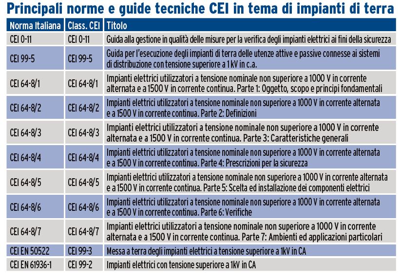 I Comitati Tecnici del CEI che si occupano di impianto di terra sono il CT 64 “Impianti elettrici utilizzatori di bassa tensione (fino a 1000 V in c.a. e a 1500 V in c.c.)” e il CT 99 “Impianti elettrici di potenza con tensioni nominali superiori a 1 kV in corrente alternata”. Una sintesi delle principali norme e guide tecniche CEI disponibili sull’argomento è riportata nella tabella.