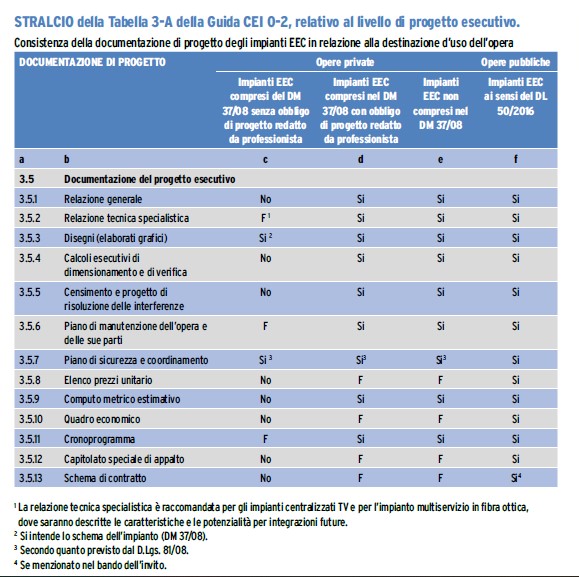 La definizione della documentazione di progetto degli impianti elettrici è obiettivo della Guida CEI 0-2 che, così come essa stessa riporta in premessa e nell’introduzione, soddisfa quanto previsto dal comma 3, articolo 5, D.M. n. 37 del 22.01.2008: «[…] I progetti degli impianti sono elaborati secondo la regola dell’arte. I progetti elaborati in conformità alla vigente normativa e alle indicazioni delle guide e alle norme dell’UNI, del CEI (… omissis…), si considerano redatti secondo la regola dell’arte». In virtù di tale richiamo legislativo, il grado di ineludibilità della citata pubblicazione è pressoché massimo visto che viene elevata a rango di norma.