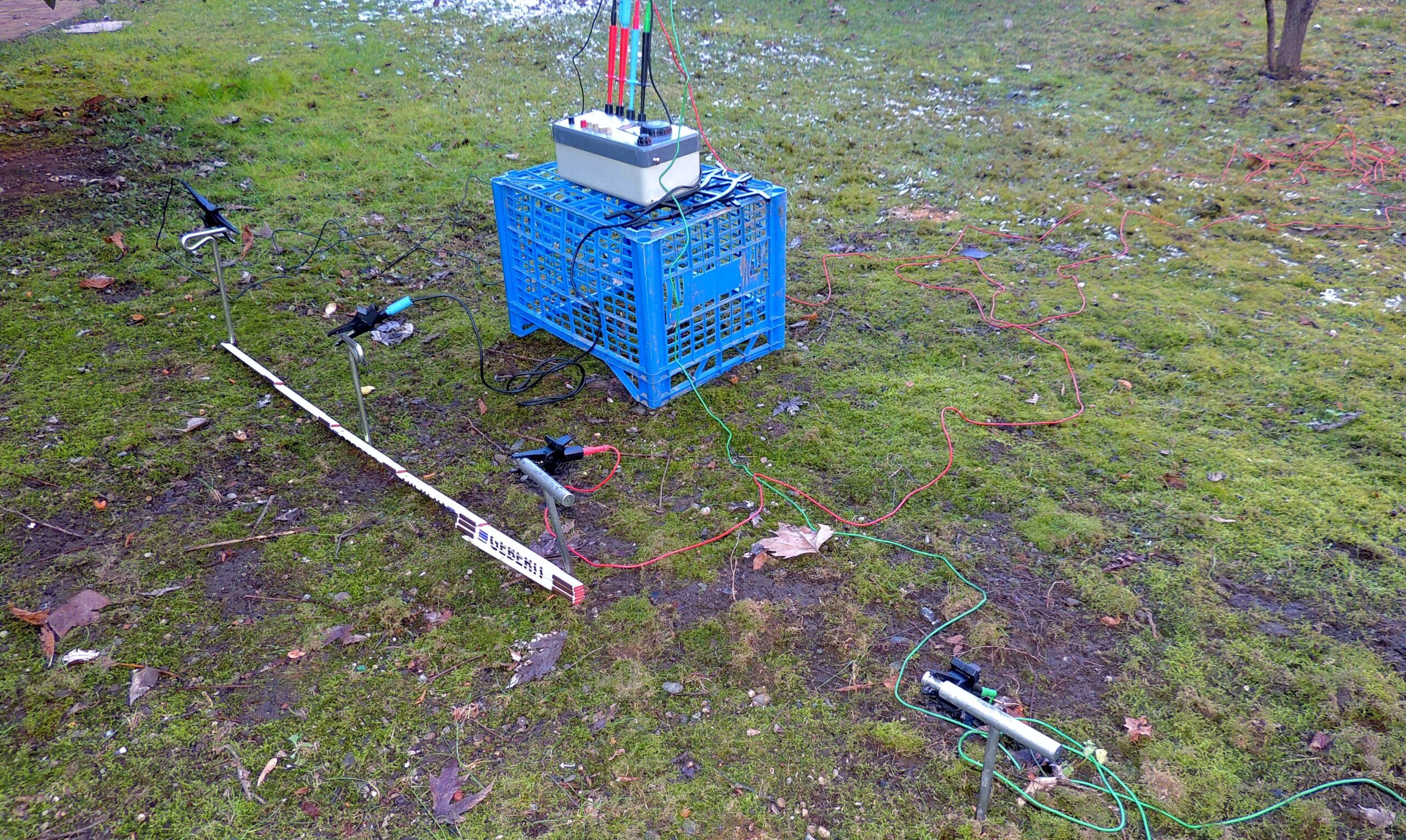 Per eseguire la misura di resistività del terreno serve un misuratore di resistenza di terra a 4 morsetti (lo stesso strumento che si usa per la misura di resistenza di terra, ma con un morsetto in più), 4 picchetti e i relativi cavi di collegamento. Si posizionano le quattro sonde in linea orizzontale ponendole alla stessa distanza una dall’altra. La distanza fra le sonde è importantissima, perché corrisponde alla profondità del terreno interessata, quindi se per esempio posizioniamo le sonde ad 1 m di distanza orizzontale fra loro, otterremo la resistività del terreno fino ad 1 m di profondità verticale; se invece posizioniamo le sonde a 5 m di distanza orizzontale fra loro, otterremo la resistività del terreno fino a 5 m di profondità verticale. La profondità di infissione delle sonde deve essere minima, di qualche centimetro, massimo una decina per ispezioni profonde. È opportuno eseguire varie misure a distanze differenti per cercare di avere informazioni sulla resistività alle varie profondità e ripetere le misure in vari punti del terreno in cui si ipotizza di posizionare il dispersore. Non è necessario eseguire le misure con particolari condizioni atmosferiche, il terreno al di sotto di una certa profondità è praticamente sempre umido e anche il gelo interessa solo la superficie.