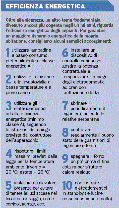 Nel caso di un condominio, è importante ricordare la necessità che tutti gli appartamenti siano dotati di un impianto a norma: la sicurezza di tutti dipende anche dalla sicurezza di ognuno. Un impianto elettrico sicuro ed efficiente vuol dire più protezione per sé, per i propri cari e per i propri beni, e bollette meno care.