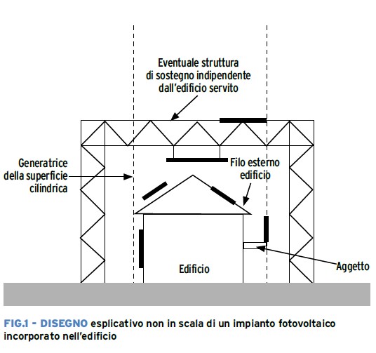 1 – Si intende un impianto i cui moduli ricadono, anche parzialmente, nel volume delimitato dalla superficie cilindrica verticale avente come generatrice la proiezione in pianta del fabbricato.