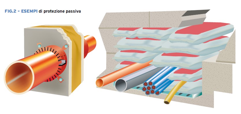 Se i sistemi di sicurezza precedentemente citati sono di tipo “attivo”, altrettanto importanti sono quelli passivi, ovvero tutti gli accorgimenti da mettere in pratica nel momento in cui vi sia un attraversamento (nel caso di specie, un cavidotto elettrico) di una parete con determinate caratteristiche di resistenza al fuoco. Per i magazzini, eventuali attraversamenti elettrici sono normalmente costituiti da passerelle, cunicoli o tubazioni (combustibili o incombustibili); in questo caso si useranno, a seconda dei casi, sacchetti intumescenti, collari, manicotti o schiume REI (figura 2).