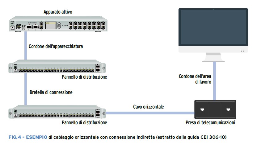 Il cablaggio orizzontale, invece, si dirama dalla dorsale in fibra ottica mediante opportuni convertitori ed è comunemente realizzato in rame per ragioni di costo. Nel caso dei centri logistici si concretizza generalmente in cablaggio con permutazione o interconnessione indiretta, ovvero le uscite degli apparecchi attivi di distribuzione vengono terminate su di un pannello di permutazione (figura 4).