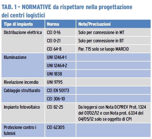 Infine, l’ampia planivolumetria dell’edificio impone al progettista un’attenta valutazione del rischio legato alla fulminazione atmosferica facendo riferimento non solo alle perdite di vite umane (Rischio R1 – valutazione obbligatoria ai sensi del DM 37/08 e s.m.) ma anche al rischio di perdita economica (Rischio R4 – valutazione facoltativa) stante il valore degli impianti e la quantità delle merci stoccate; tale analisi – condotta ai sensi del corpo normativo CEI EN 62305 “Protezione contro i fulmini” – potrebbe portare, infatti, all’installazione di un sistema captante tipo LPS (Lightning Protection System). Le normative da rispettare nella progettazione dei centri logistici sono ricapitolate in tabella 1.