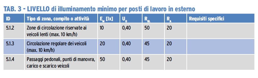 Gli impianti di illuminazione, normalmente montati su blindo luci all’interno della logistica, saranno costituiti da proiettori Led, che riescono a utilizzare fino all’85% dell’energia in meno rispetto alle sorgenti luminose tradizionali, mantenendo tuttavia la stessa intensità di flusso luminoso. Non dovrà mancare il rispetto di alcune prescrizioni minime riportate all’interno della tabella 5.4 della Norma UNI 12464-1 (ved. tabella 2) e all’interno della tabella 5.1 UNI 12464-2 (ved. tabella 3).