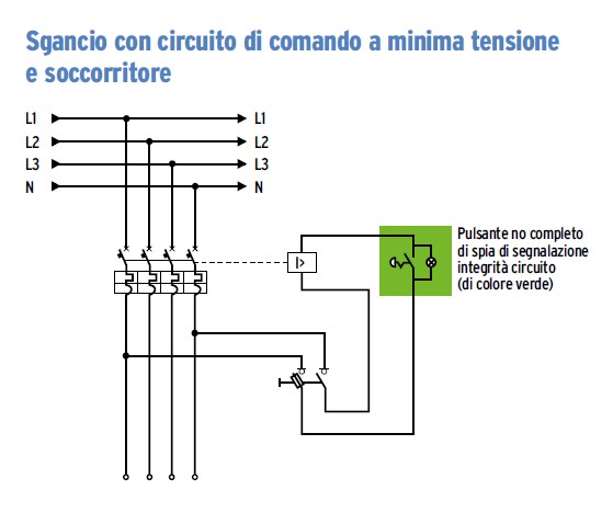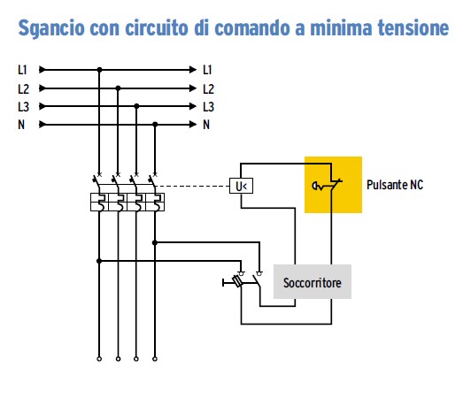 Non è prescritta l’alimentazione di tipo SELV del circuito di comando ma, qualora vi si ricorresse, non bisognerebbe preoccuparsi di lasciare in tensione il circuito di comando in seguito allo sgancio poiché il livello di tensione è innocuo. Ciò è molto utile quando si realizza un comando di emergenza installato all’interno del compartimento da servire.