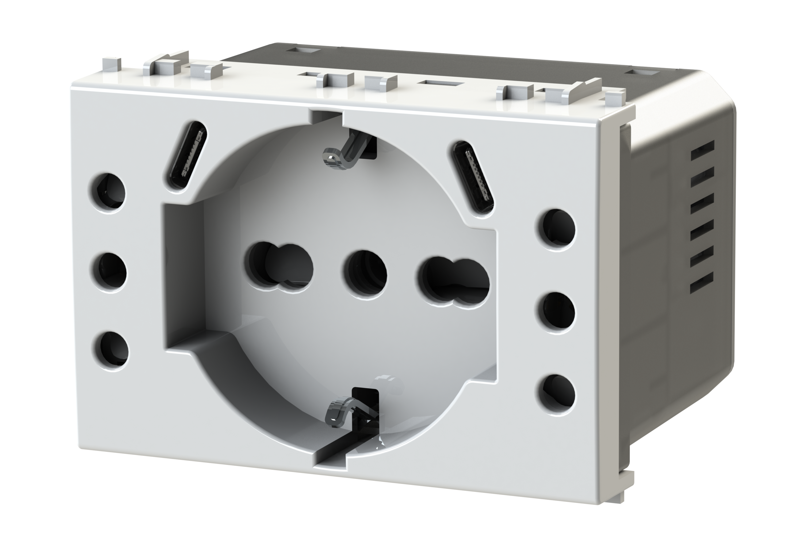 Per quanto riguarda la versione chiamata USB P503 dotata oltre che delle prese elettriche anche di un potente alimentatore USB con la capacità di erogare fino a 3 Ampere con 2 uscite di tipo C, le combinazioni disponibili all’interno di una scatola da 3 moduli sono addirittura 5. Di fatti è possibile alimentare fino a 2 dispositivi dotati di spina da 10 ampere, 1 dispositivo dotato di spina schuko o di spina italiana da 16 ampere e 2 dispositivi che necessitano di un’alimentazione per ricaricarsi da 5 volt come smartphone, tablet e anche personal computer.