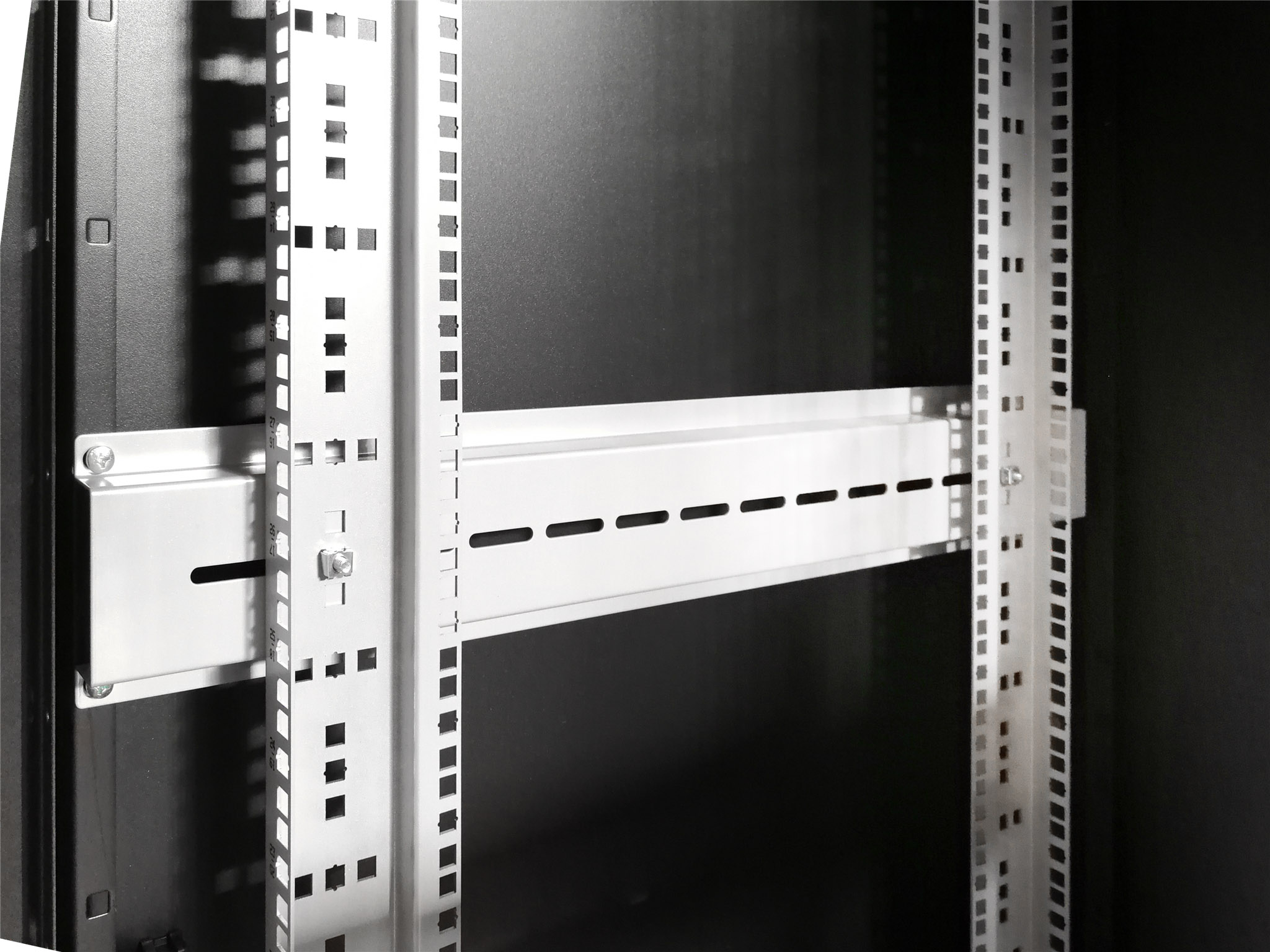 Altre caratteristiche fondamentali sono la doppia coppia di montanti numerati 19″ anteriori e posteriori regolabili con unità numerate, il tetto predisposto con foratura per sistema di ventilazione e provvisto di ingresso cavi, e il fondo predisposto per ingresso cavi e dotato di sportello che può essere mantenuto chiuso, per permette di appoggiare apparati come UPS, o aperto per favorire il ricircolo d’aria. Inoltre, vengono forniti completi di piedini o di zoccolo removibile che garantiscono una portata statica massima di 500 kg (220 kg portata su ruote); in caso di necessità zoccolo o piedini possono essere rimossi e sostituti da ruote acquistabili separatamente.