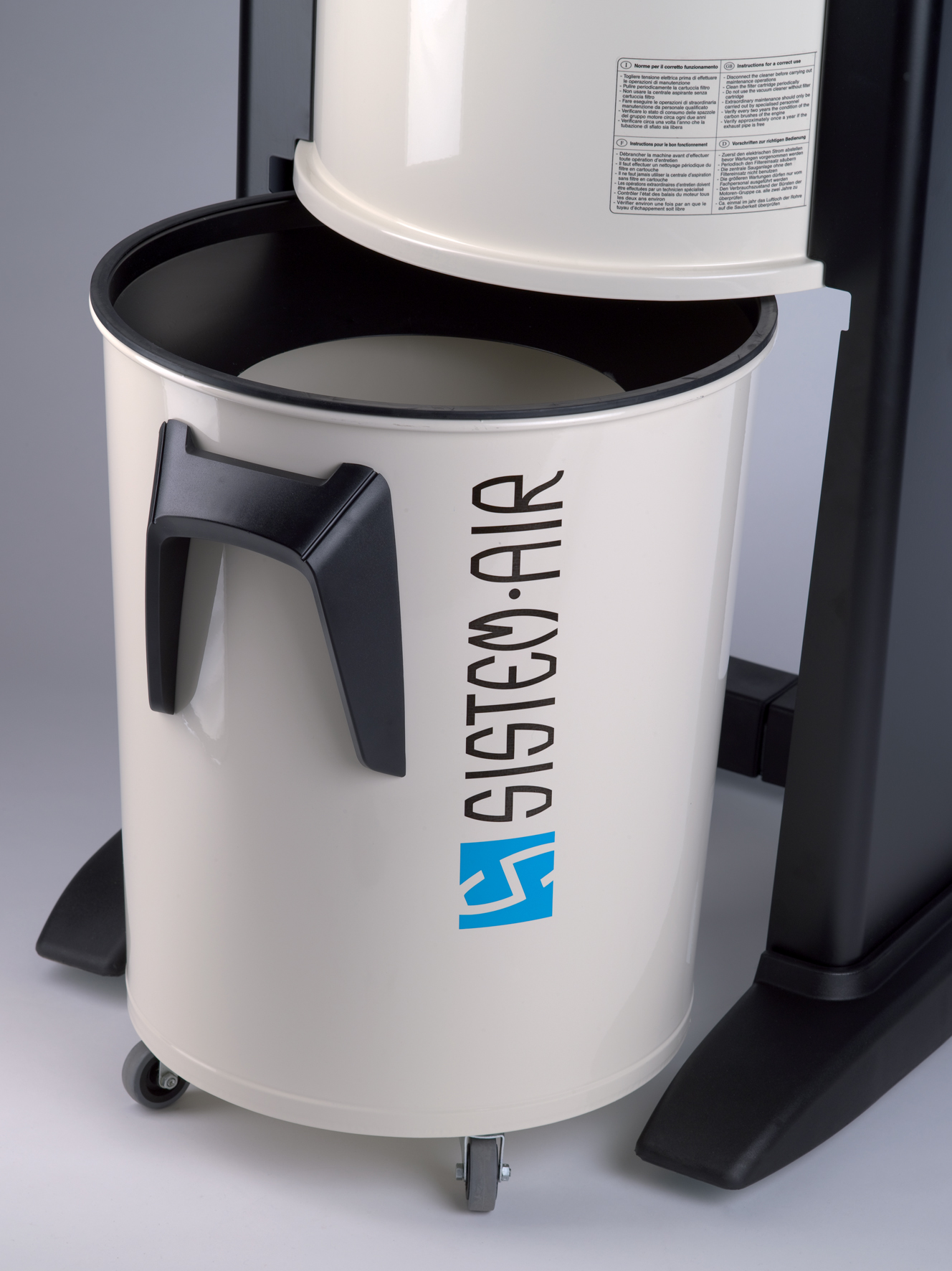 • SECCHIO RACCOLTA: il secchio di raccolta polveri ha una capacità di ben 62 litri, è dotato di rotelle per una facile movimentazione, ed adotta un pratico sacco con tendisacco per facilitarne lo svuotamento. Lo sganciamento del secchio avviene per mezzo di un pratico maniglione rivestito di materiale antiurto, con meccanismo a basso sforzo.