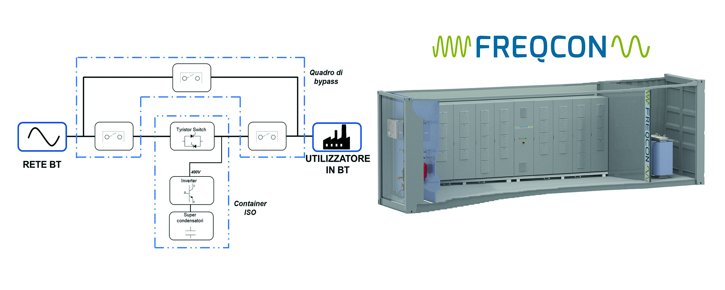 I buchi di tensione vengono rilevati dal sistema di controllo entro 1 ms e il commutatore statico a tiristori FFD disconnette la rete entro 10 ms (zero crossing) per permettere alla potenza attiva e reattiva immessa di stabilizzare l’alimentazione del carico.