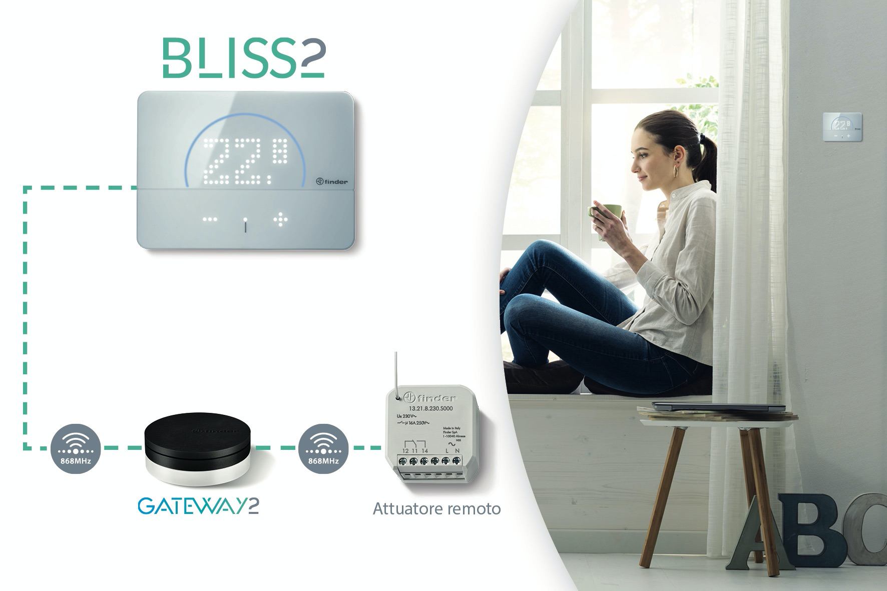 Il termostato connesso BLISS 2 di Finder è la soluzione ideale per ogni tipo di applicazione residenziale o terziaria in cui sia richiesto comandare da smartphone, anche in modo centralizzato, l’impianto di riscaldamento/raffrescamento in uno o più ambienti.