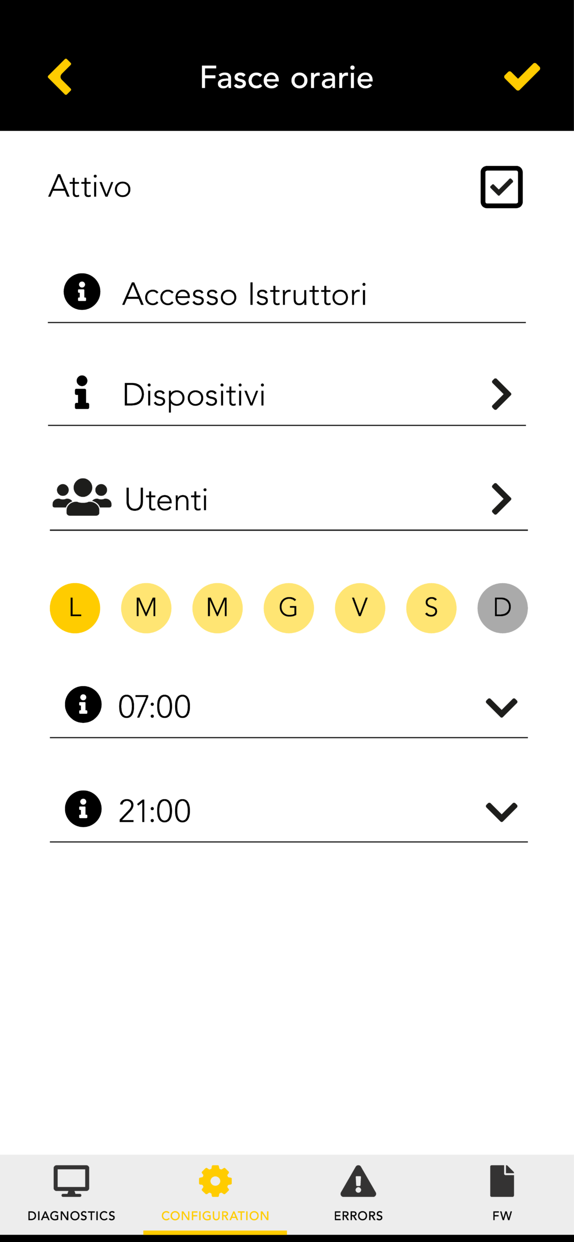 Nella modalità Security Mode è possibile attivare l’apertura o la chiusura di un dispositivo specificando una fascia oraria precisa. L’utente abilitato all’ingresso per un determinato dispositivo, o più, potrà usufruire dell’ingresso per tutta la durata della fascia oraria stabilita. L’attivazione del comando deve avvenire accedendo all’App dove sarà possibile creare più fasce orarie e gestire più comandi facendo una programmazione settimanale.